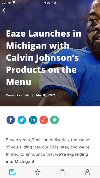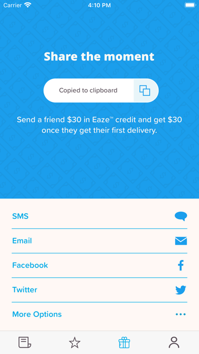The Eaze app allows users age 21+ to sign up, log in, track orders, view the blog, copy/share their referral code.