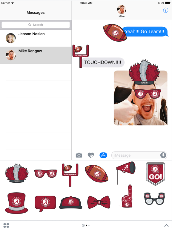 This is an officially licensed Premium Sticker Pack from the University of Alabama. The University of Alabama Premium Plus pack includes over 80 various stickers including the Alabama logo, Alabama branded footballs and basketballs, Alabama branded football goal posts, chat bubbles, eyeglasses, hats, wigs, beards, helmets and more. These stickers can be used in iMessage to show your school spirit in text messages and on photos. Just drag them onto your message thread or onto a photo sent through iMessage and they will be shared instantly with whomever you are messaging with. Have fun and Roll Tide!!