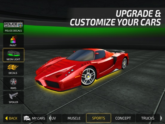 - Customize your cars with cool Decals, Spoilers, Rims, Neon Lights, Police Decals, Neon Spectrum along with stylish car finishes like Glossy, Matte, Metallic, Chrome