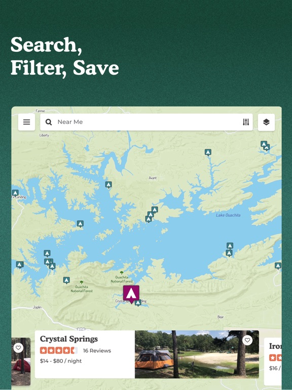 * Filter by tent, RV, cabin, glamping, distance, rating & more.