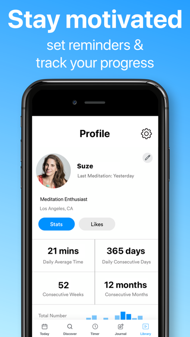 - Stay motivated by setting meditation reminders, goals & track your profile stats