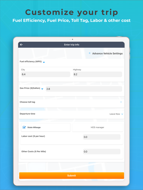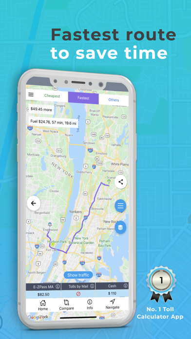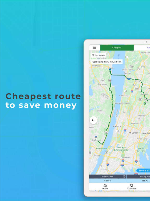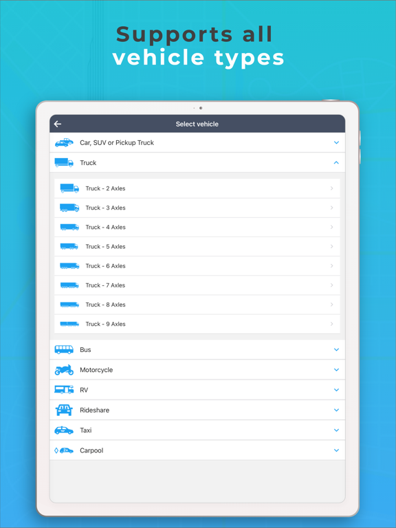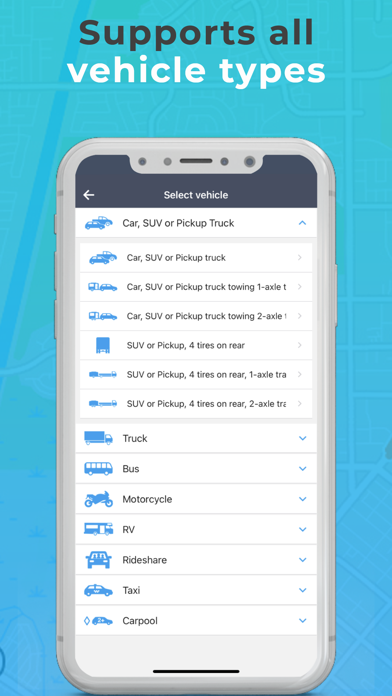 TollGuru Toll & Fuel (gas, petrol, diesel, electricity) trip calculator computes toll & cost for car, carpool, taxi, rideshare, truck, trailer, bus, RV and motorcycle. Travel on the cheapest, the fastest, and compromise routes post time and cost tradeoff.