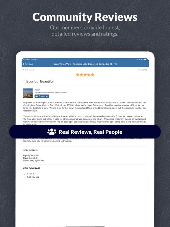 "Since I work remotely I rely on cell signal, and Campendium is awesome at making cell signal a commonly reviewed item, so I know where I can actually stay! Plus it’s a great mix of free and paid campsites. and the site is so well designed and user friendly. Definitely my favorite campsite resource. Can’t wait for the app." - Tami