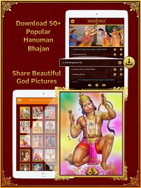 Contains Hanuman Chalisa, Sunderkand, Aarti, bajrag ban,Ashtak, Amritwani, Hanuman Stotam Sampurna Ramayan by Shri Ravindra Jain, Sanshipt Ramayan (Mangal Bhavan),50+ Popular Hanuman Bhajans, Photo gallery, Known - Hanuman Janm Katha, 108 Names,how to pray (puja), Benefits of Chalisa and Sunderkand , etc.