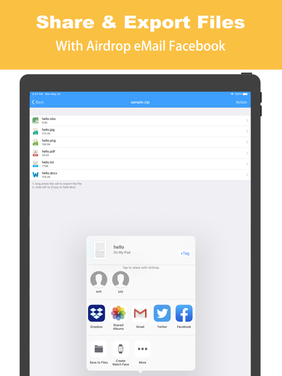 After decompression of the privacy file can be copied to the file safe box, file safe box support touchid and gesture dual certification, protection of privacy does not leak. Mobile phone privacy photos, video can also be easily imported.
