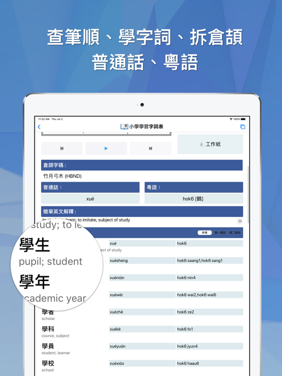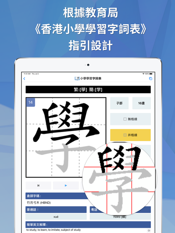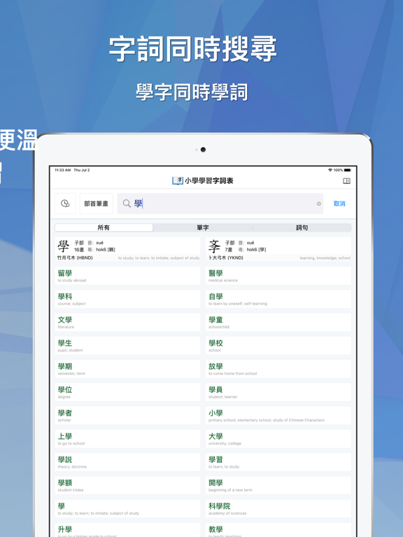 The Elementary Chinese Dictionary is a mobile learning application developed in accordance with the Hong Kong Primary School Learning Word List and the Commonly Used Word Forms compiled by the Hong Kong Education Bureau.