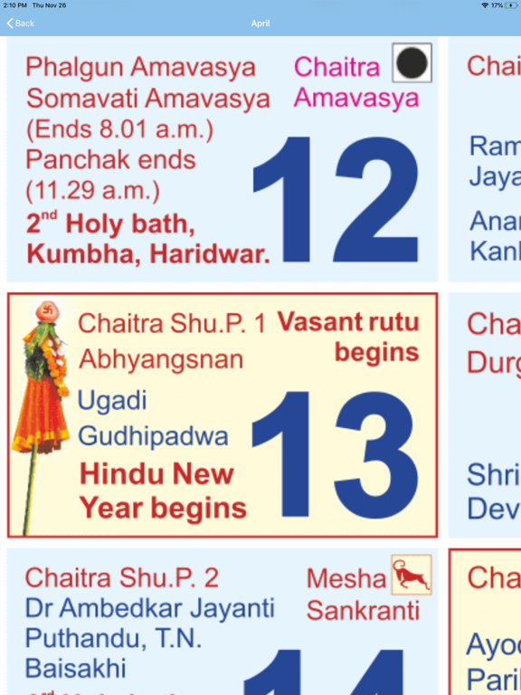 1. Detailed tithis (Indian Calendar system. Both Amavasyant and Pournimant panchang systems have been incorporated). So each date box in the calendar is accompanied with details of tithis in English.