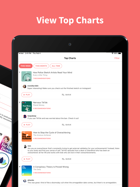• Find podcast recommendations from friends and tastemakers to find new podcasts.
