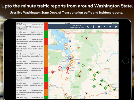 Live traffic reports and cameras for Washington state including Seattle, Spokane and Tacoma. Save your favorite cameras for quick access. The February 2018 release optimises for iOS11 and the iPhone X.