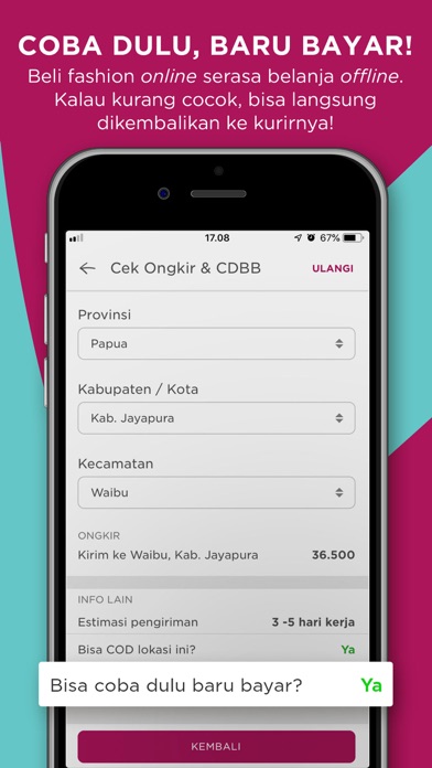 Sista bisa coba dulu produk yang dipesan ketika kurir datang. Kalau nggak cocok, bisa langsung balikin ke kurir, dan bayar yang cocok aja! Layanan ini berlaku di seluruh Indonesia.