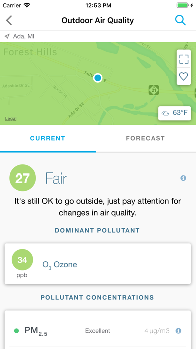OUTDOOR AIR QUALITY: Receive real-time pollution information in your area, search other areas to see the most up-to-date air quality information, and save favorites so you can quickly see the air quality of locations that matter to you.