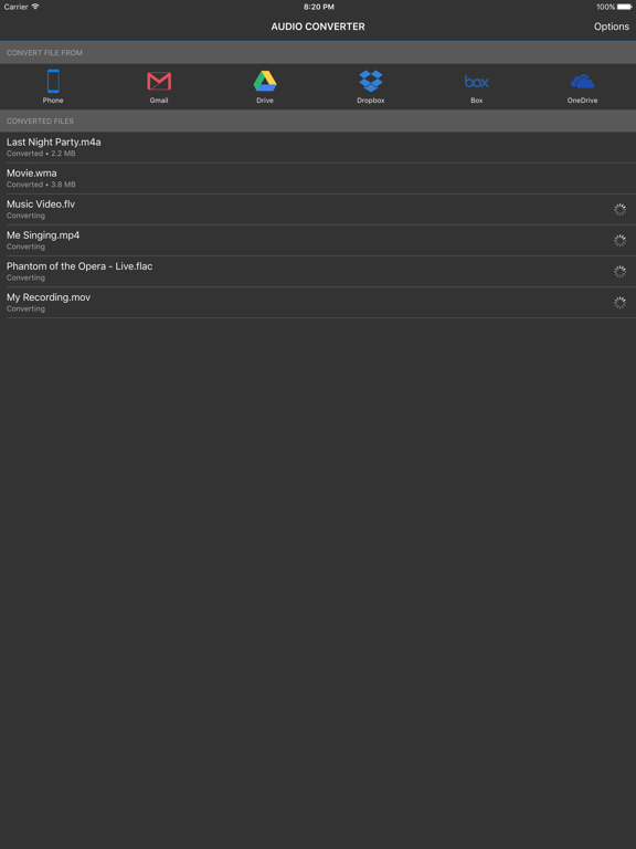 Convert your music, recordings and other audio files to various formats, right on your iPhone or iPad. Conversions are very fast and quality is preserved. You can convert files from your phone, or files from your favorite cloud services directly within our app. Files are being converted by our powerful servers, and after conversion is done, result is downloaded to your device and files are being deleted from our servers. This also means the app won't burden your processor or RAM, nor it will drain your battery.
