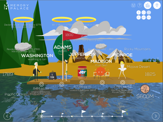 Challenge your mind and memory while learning US History in a fun, new, and creative way. In 30 minutes or less, the Memory Palace US History App lets anyone learn the US Presidents and related US History such as wars, dates, territorial expansion, economics, civil rights milestones, and geography. If you're passionate about the US and its history, this is the app for you.