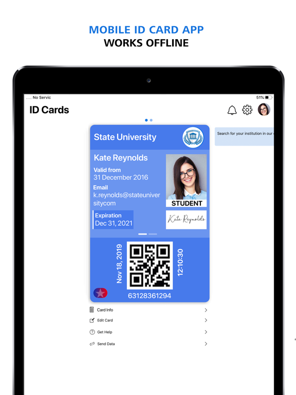 ID123 is a mobile ID card application for schools, businesses and membership organizations. Administrators can use the cloud-based ID management system to securely issue and manage digital ID cards into this mobile app.