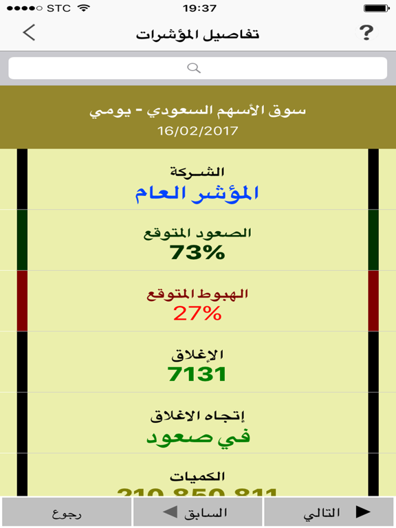 • يظهر الأسعار المتوقعة في حال الصعود والأسعار المتوقعة في حال الهبوط لكل الأسهم/العملات وللمؤشر العام.