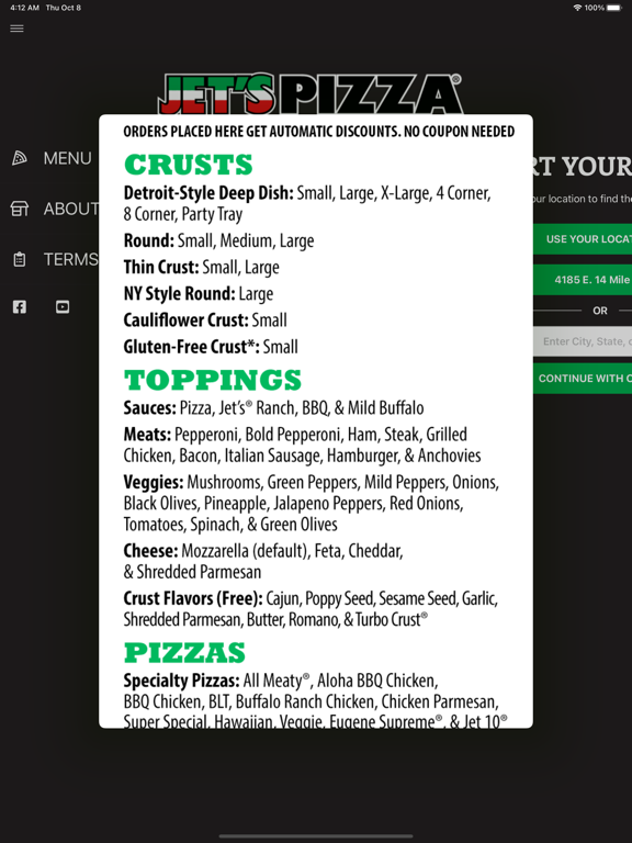 - GPS LOCATOR: Find a Jet’s Pizza® store based on your current GPS location.