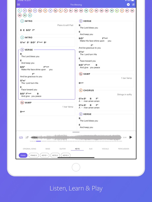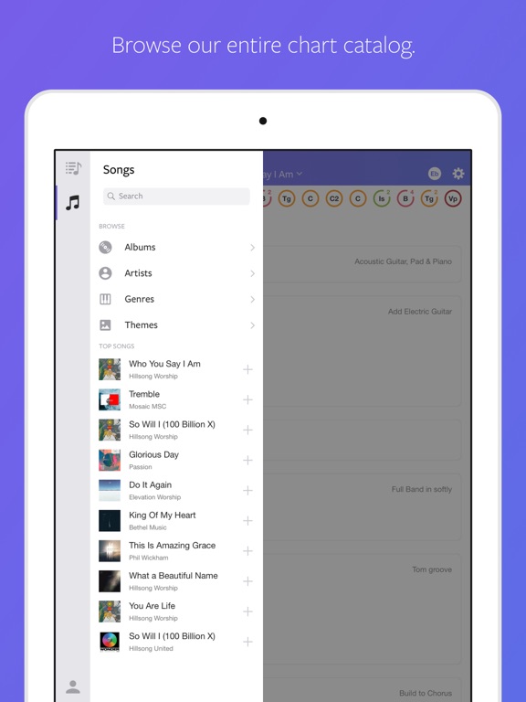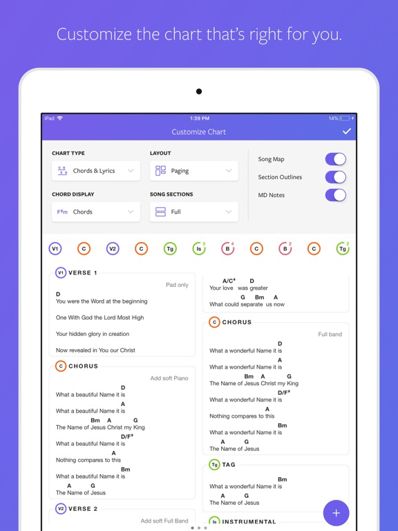 ChartBuilder® is an app that allows you to endlessly customize each chart to meet your needs. Convenient filters allow you to change the Key, Capo, Chord Display, Layout, and more. Lead with confidence.
