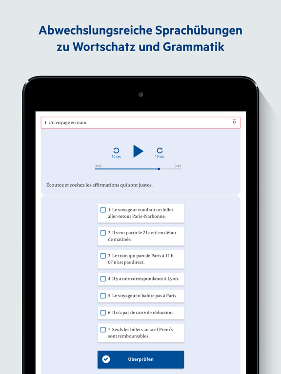 Lernen Sie die französische Sprache ganz nebenbei – auf dem Weg zur Arbeit, beim Kochen oder beim Sport. Denn wer eine Fremdsprache hört, verbessert nicht nur seine Aussprache, sondern erweitert auch ganz nebenbei seinen Wortschatz. Der Audio-Trainer bietet Ihnen dafür 60 Minuten Hörtraining pro Monat.
