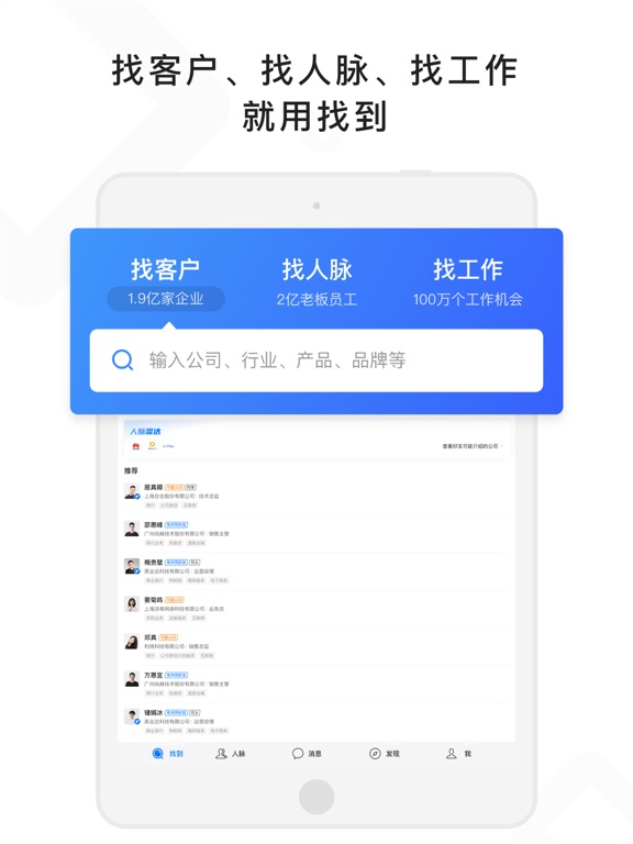 「找到」是一款商业搜索工具,提供找人、找公司、找商机等强大的搜索功能,覆盖1.9亿家企业和2亿商务人士。 特色功能: 搜索:通过搜索,找到自己的意向客户发起会话,一键直达意向客户; 人脉:通过人脉路径,找到熟人可介绍的商机人脉,盘活自身资源; 群聊:建立商务社群,分享商务资讯,经营自己的商务圈子; 商机:汇集全网采购商机,第一时间掌握动态; 监控:实时监测竞争对手动向,了解企业背景,跟踪行业动向;