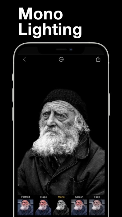 - Unique portrait effects (black and white portrait effect, studio portrait effect, detail, color splash, stylize, grain) that are carefully crafted for portrait photos.