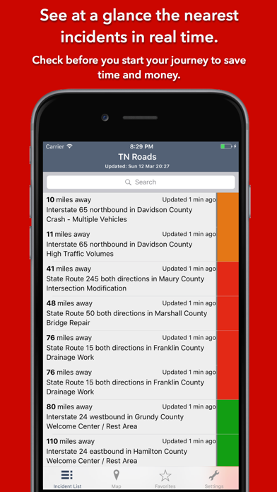 - Shows current incidents in order of distance from your current location (closest incidents are shown first).