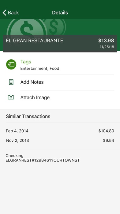 Add Tags, Notes, Images & Geo-Information: By enhancing transactions with custom tags, notes or photos of a receipt or check, you have the ability to stay organized and find exactly what you’re looking for when searching through your finances.