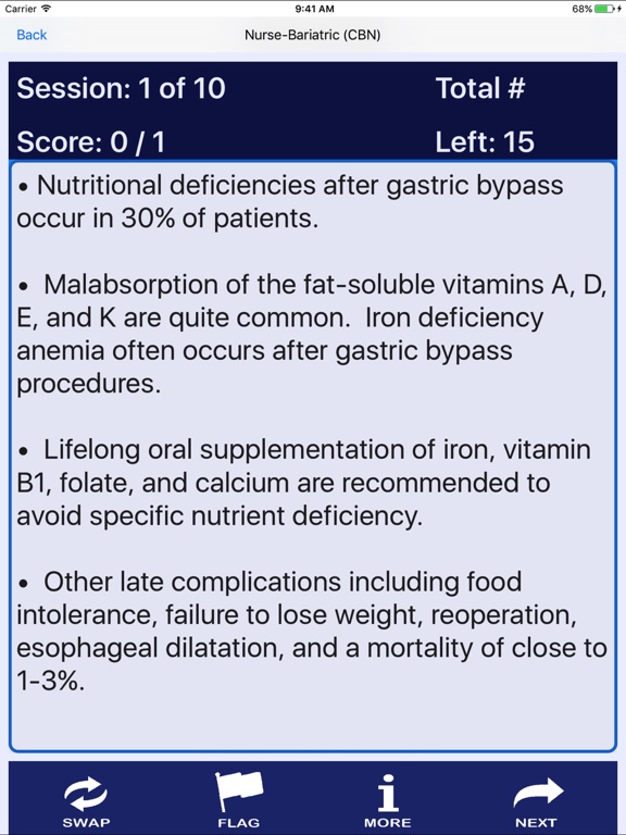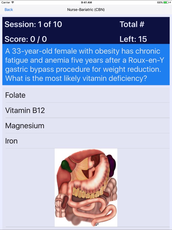 The app offers 10 or more free multiple-choice questions with explanations for 79 different Registered Nurse certifications. Each specialty offers additional questions which are available as an in app purchase. The following specialties are available: