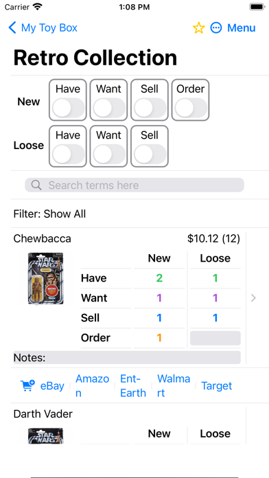 Need a figure and just cannot seem to find it?  Tap the eBay, Amazon button or magnifying glass to search Amazon, Walmart and eBay for the figure.  Now there are more buying, price checking, and price matching options.