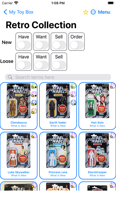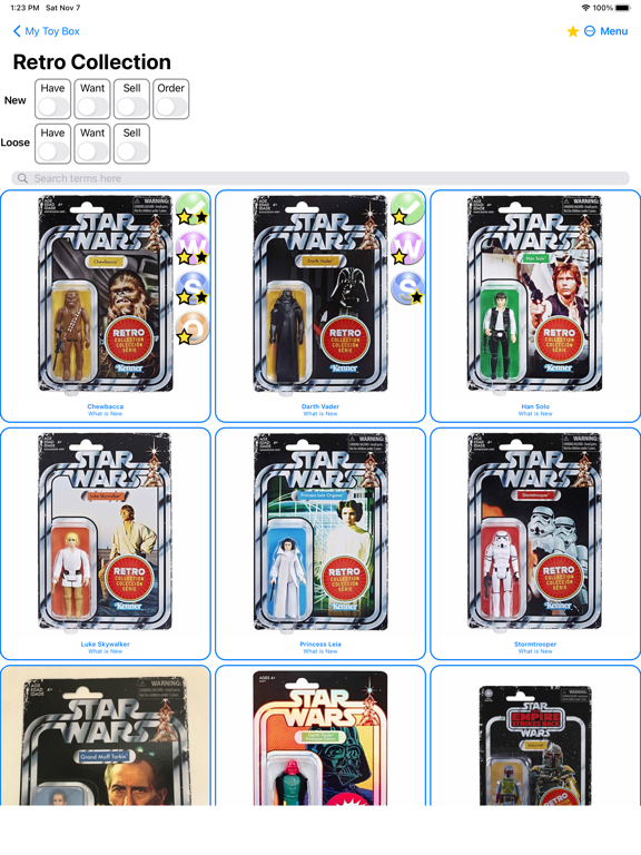 My Toy Box opens to a collectible view showing all of the Star Wars Vintage, Power of the Force (II), Episode 1 - The Phantom Menace, Power of the Jedi, Saga 2002 - 2004, Clone Wars 2003 - 2005, Revenge of the Sith, The Saga Collection, 30th Anniversary Collection, The Vintage Collection (original and 2018), The Clone Wars 2008-2009, 2009, 201-2011, 2012, 2013, The Original Trilogy Collection, Saga Legends 2008, 2009, 2010-2011, 2013 & 2014, The Legacy Collection 2008 - 2009 & 2009 - 2010 & 2013 - 2015, Discover the Force, Movie Heroes, The Force Awakens, Rogue One, Black Series 3.75" and 6", Disney Stores 3.75", The Last Jedi "Force Link", Solo: A Star Wars Story "Force Link 2", Resistance, Galaxy of Adventures, Disney Stores, and Skywalker Saga figures.  An easy to see which figures you have and which figures you want.  Easily switch between a picture view and an estimated value view.