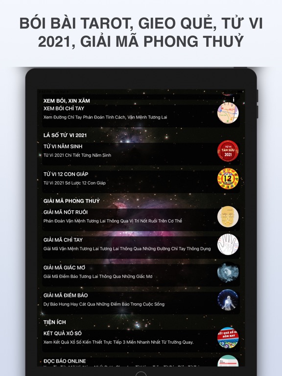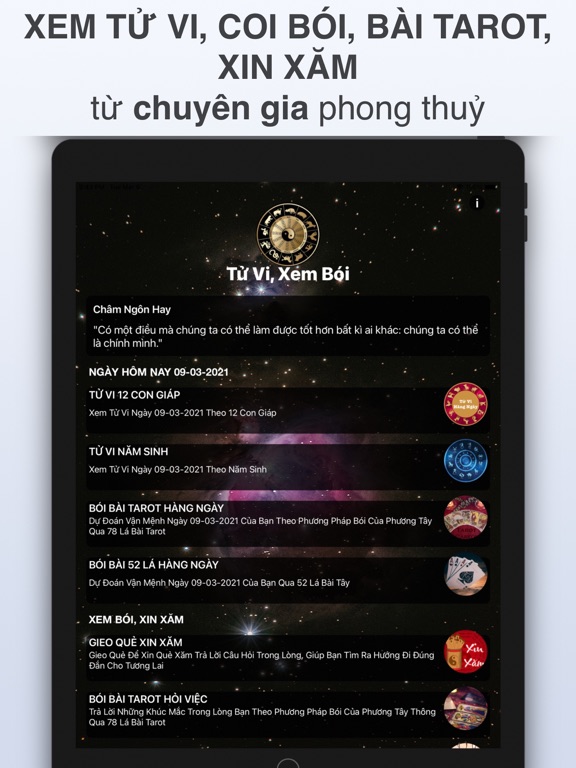 Ứng dụng XEM BÓI, XEM TỬ VI, GIEO QUẺ XIN XĂM, GIẢI MÃ PHONG THUỶ với nội dung được sưu tầm và biên soạn công phu, tỉ mỉ từ chuyên gia phong thuỷ. Đây là một ứng dụng toàn diện và đầy đủ nhất, giúp bạn hiểu rõ về tiền tài, vận hạn, cuộc sống của mình, giúp bạn tránh mọi tai ương, nghênh tài nghênh lộc.