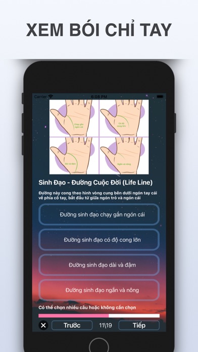 • Xem bói chỉ tay trọn đời: Tóm lượt cuộc đời và các mốc sự nghiệp, tình duyên, sức khỏe.