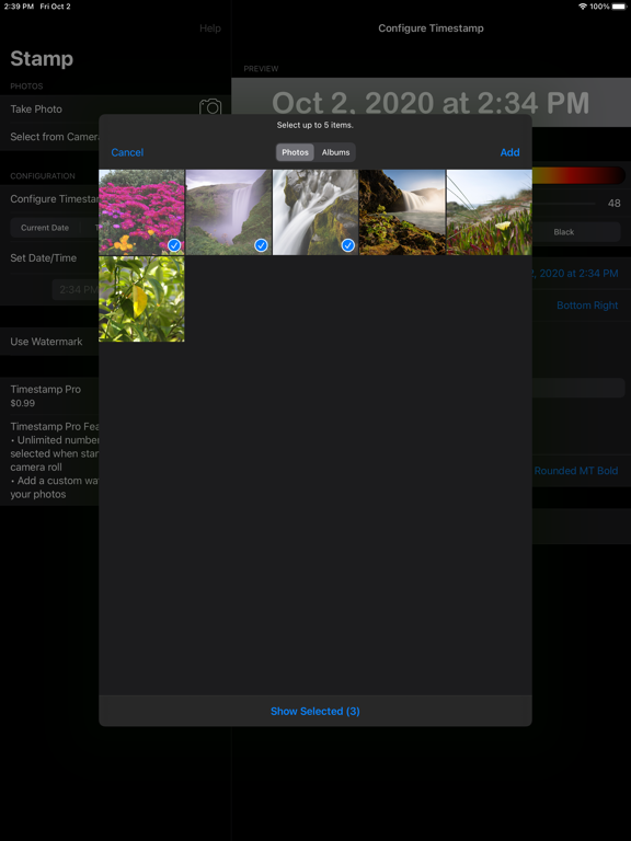 Take timestamped photos or select images already in your camera roll and add a timestamp and/or watermark to each image. Taking a photo within the app will automatically save it to your camera roll.