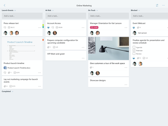Each plan has its own board, where you can organize tasks into buckets. You can categorize tasks based on their status or on whom they’re assigned to. To update the status or change assignments, just drag and drop tasks between columns.