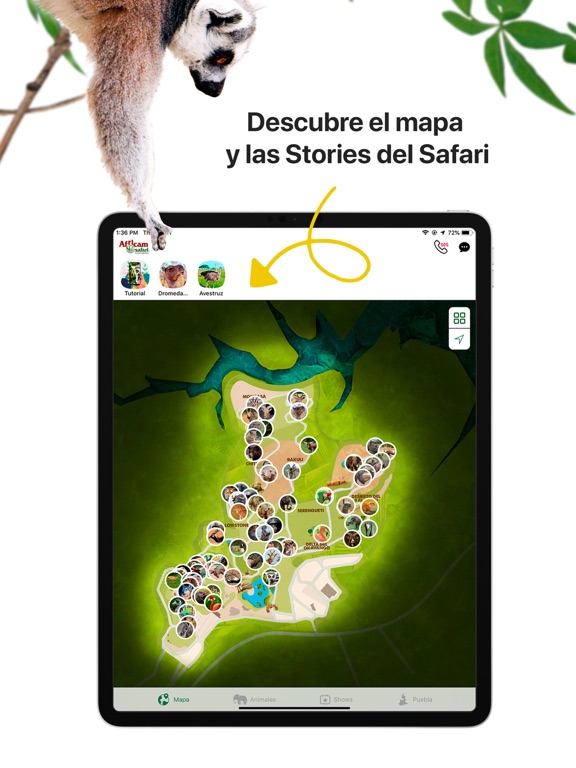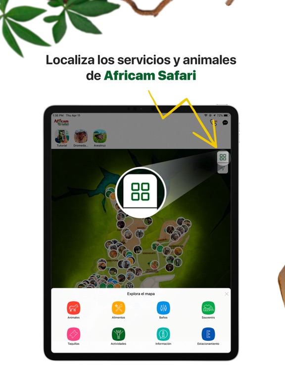 Activa tu ubicación y sigue la ruta del explorador al pasar por los distintos territorios del safari. Pero eso no es todo. En el mapa encontrarás la localización de servicios, restaurantes, áreas de convivencia en medio de la naturaleza, y por supuesto, nuestras tiendas de souvenirs para que te lleves a casa un recuerdo de tu gran aventura.