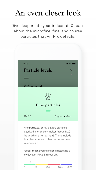 The particle sensors in Air Pro and Air Mini+ help you see your indoor air particle level with a color-coded scale, giving you a window into your air.