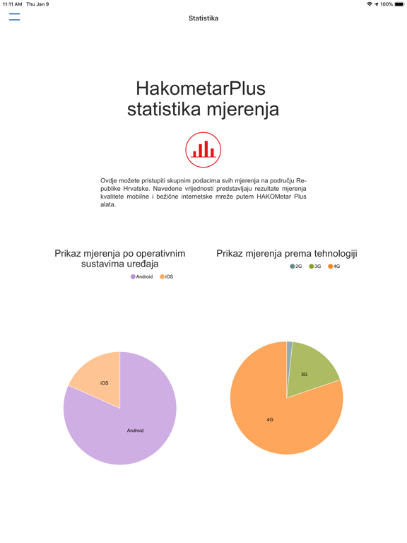 - pregled svih rezultata mjerenja na karti s mogućnosti filtriranja po parametrima testa, statistici, operateru i vremenskom razdoblju,