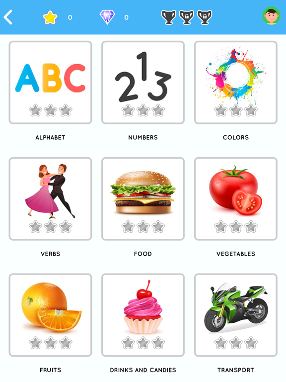 Basic: Alphabet letters , Numbers , Colors , Verbs , Food …