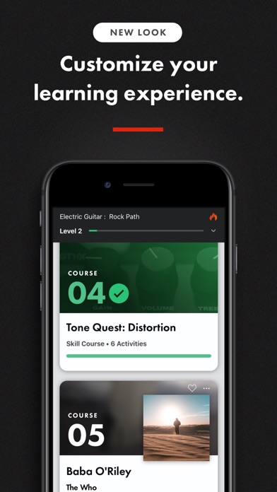 o Learn chords and riffs in minutes on structured learning paths that teach guitar basics and intermediate techniques using popular songs.