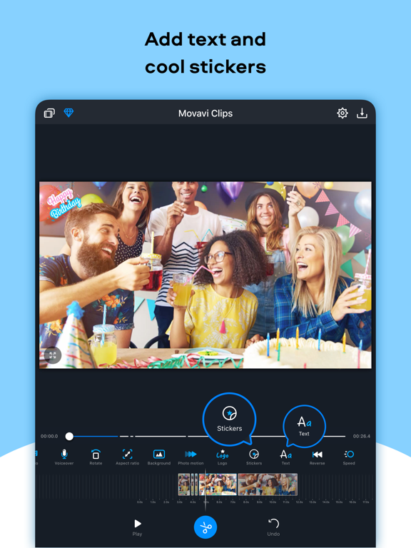 No experience in editing? Don’t worry! With the Movavi Clips video editing app, you don’t need any special knowledge or skills to create movies for your vlog or family archive. When you open the app, you will see valuable tips that will help you master our video clip maker in minutes.