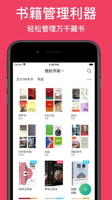 用户可以通过扫条形码、搜索的方式添加书籍。添加的书籍可标记为正在阅读、未读书籍两种,查看阅读进度、阅读类型、记录读书笔记,轻松管理。