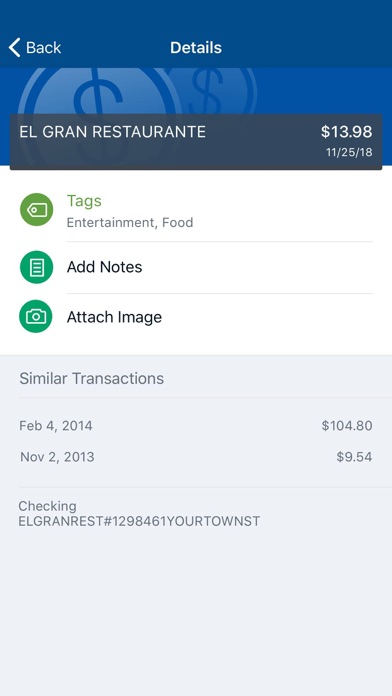 Add Tags, Notes, Images & Geo-Information: By enhancing transactions with custom tags, notes or photos of a receipt or check, you have the ability to stay organized and find exactly what you’re looking for when searching through your finances.