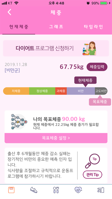 - 임신 중, 나의 예상 체중 및 권장 체중을 알려주고 관리방법을 제공합니다.