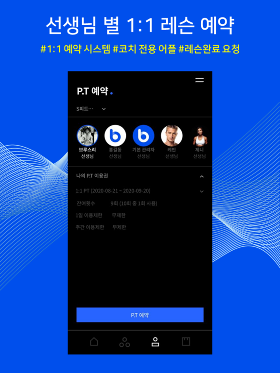 바디코디 가맹점을 이용하는 고객들은 별도로 수업시간을 선생님과 조율할 필요없이 스마트폰에서 언제든지 이용할 시간을 미리 예약할 수 있습니다.