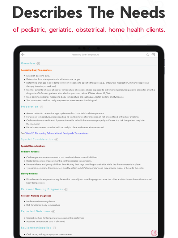 - A “Special Considerations” section in each procedure that describes the needs of pediatric, geriatric, obstetrical, and home health clients.