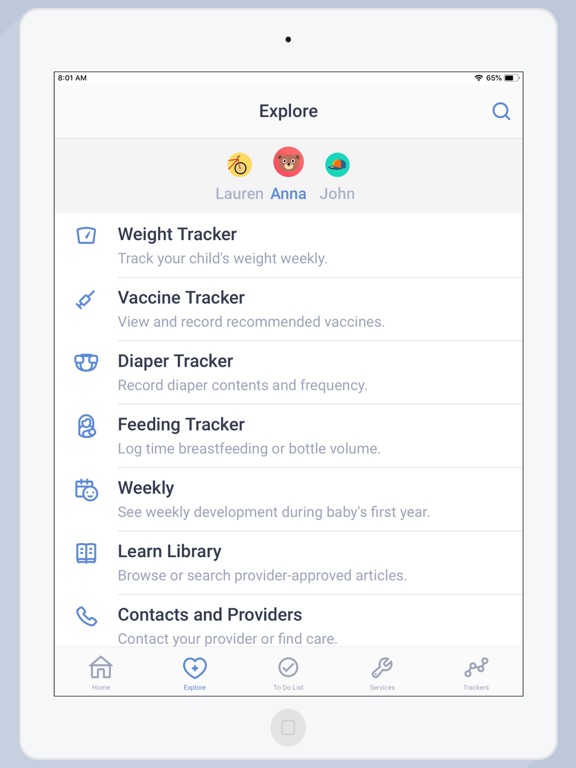 • Health-tracking tools for growth, feeding, diaper changes and vaccines.