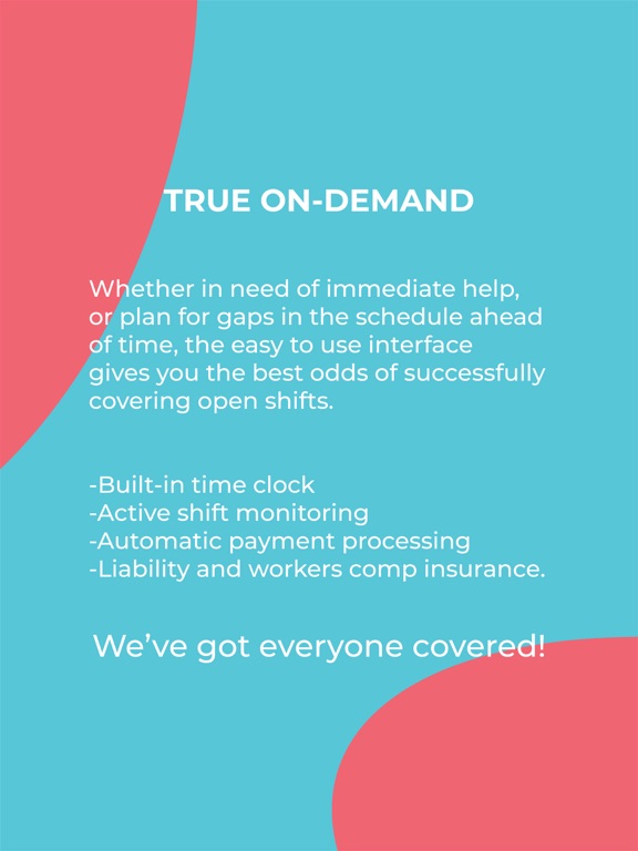Whether in need of immediate help, or plan for gaps in the schedule ahead of time, the easy to use interface gives you the best odds of successfully covering your open shifts with vetted high-caliber professionals. With built-in time clock, active shift monitoring, automatic payment processing, liability and workers’ comp insurance, we’ve got you covered with the industry's most reliable staffing solution.
