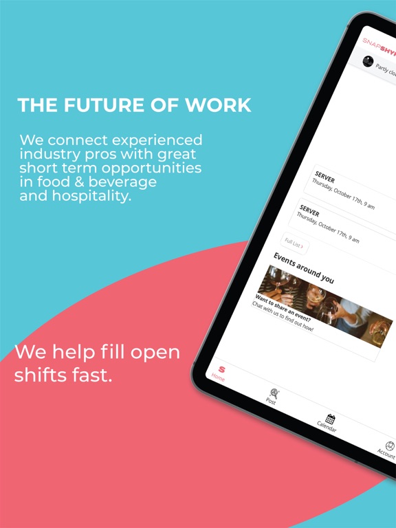 The simple way to work— Get shift alerts for on-demand opportunities, or view the calendar for shifts further out to earn income at new and exciting venues. Using the app is simple: claim a shift you qualify for, arrive at the indicated time ready to contribute, get paid (rinse & repeat). All approved workers are 1099 contractors of SNAPSHYFT.