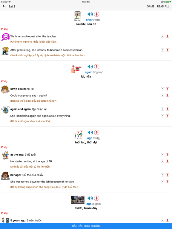 + Âm thanh của các từ, các ví dụ là do người đọc, không phải đọc tự động bằng máy như các ứng dụng tu vung tieng anh khác --> đảm bảo sự chính xác của âm điệu