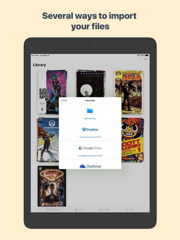 Comics can be imported using Dropbox, Google Drive, Microsoft OneDrive, Ubooquity, Komga, OPDS, embedded server, iCloud, iTunes, external drives, receive or send them via Airdrop, or importing them from other apps using drag and drop.