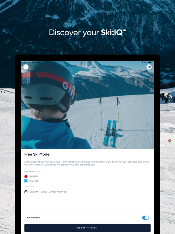 To really take your skiing to the next level, connect the app to the Carv smart ski boot insole for real-time audio instruction. Carv uses advanced pressure sensors to see exactly where your skiing technique is lacking, then immediately tells you how to improve as you ski. Carv is the world’s first ski wearable with real-time audio coaching.